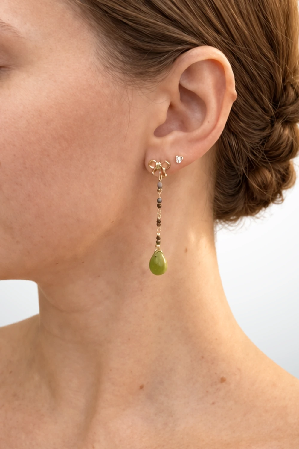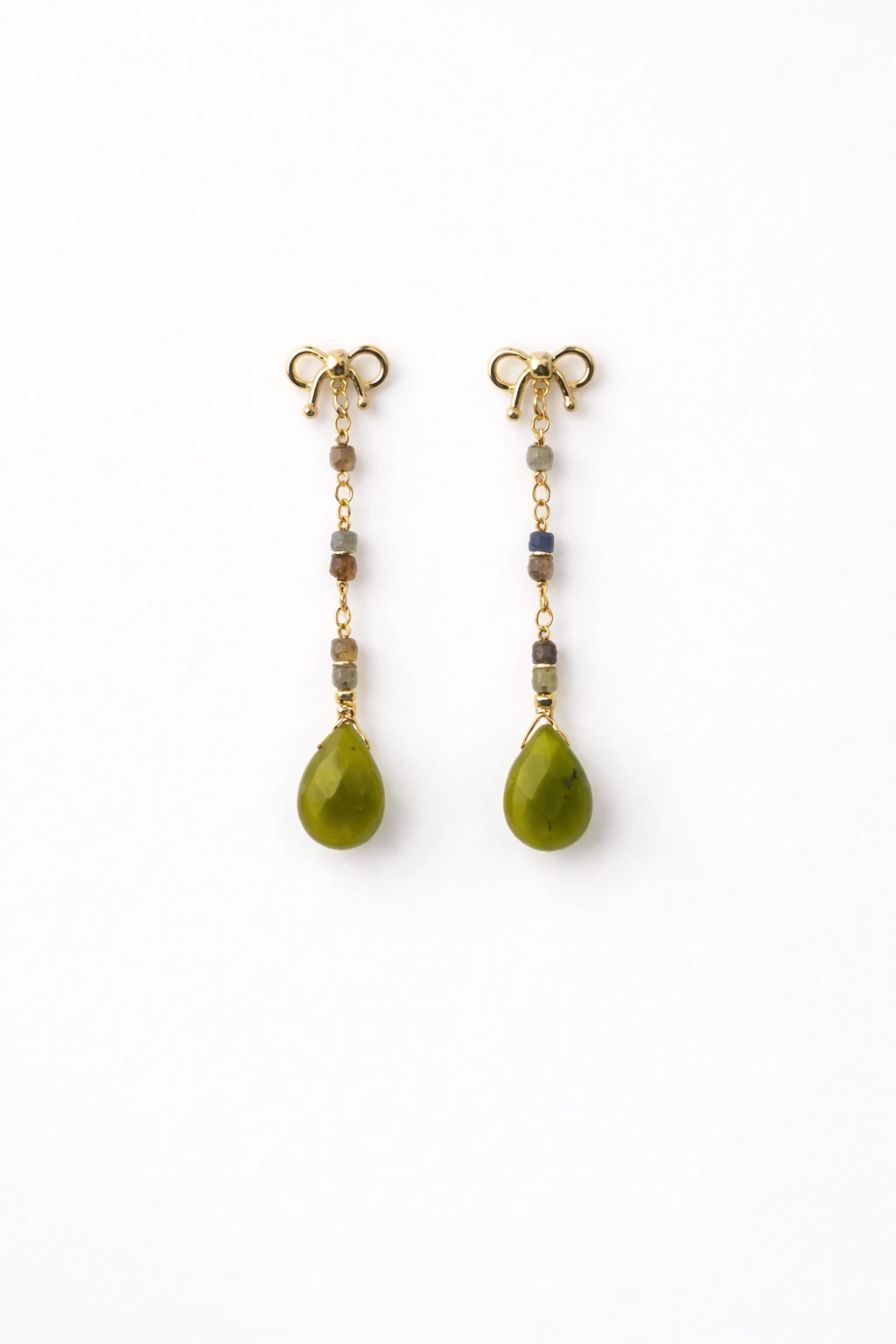 Cheio de personalidade, o brinco autoral em fio traz um mix de pedras, criando um visual rico em cores e texturas. O destaque fica para a delicada gota de turmalina, que adiciona sofisticação e movimento à peça. A base em formato de laço com banho em ouro 18K completa o design com um toque elegante e feminino, tornando o brinco perfeito para quem busca um acessório único e cheio de estilo.