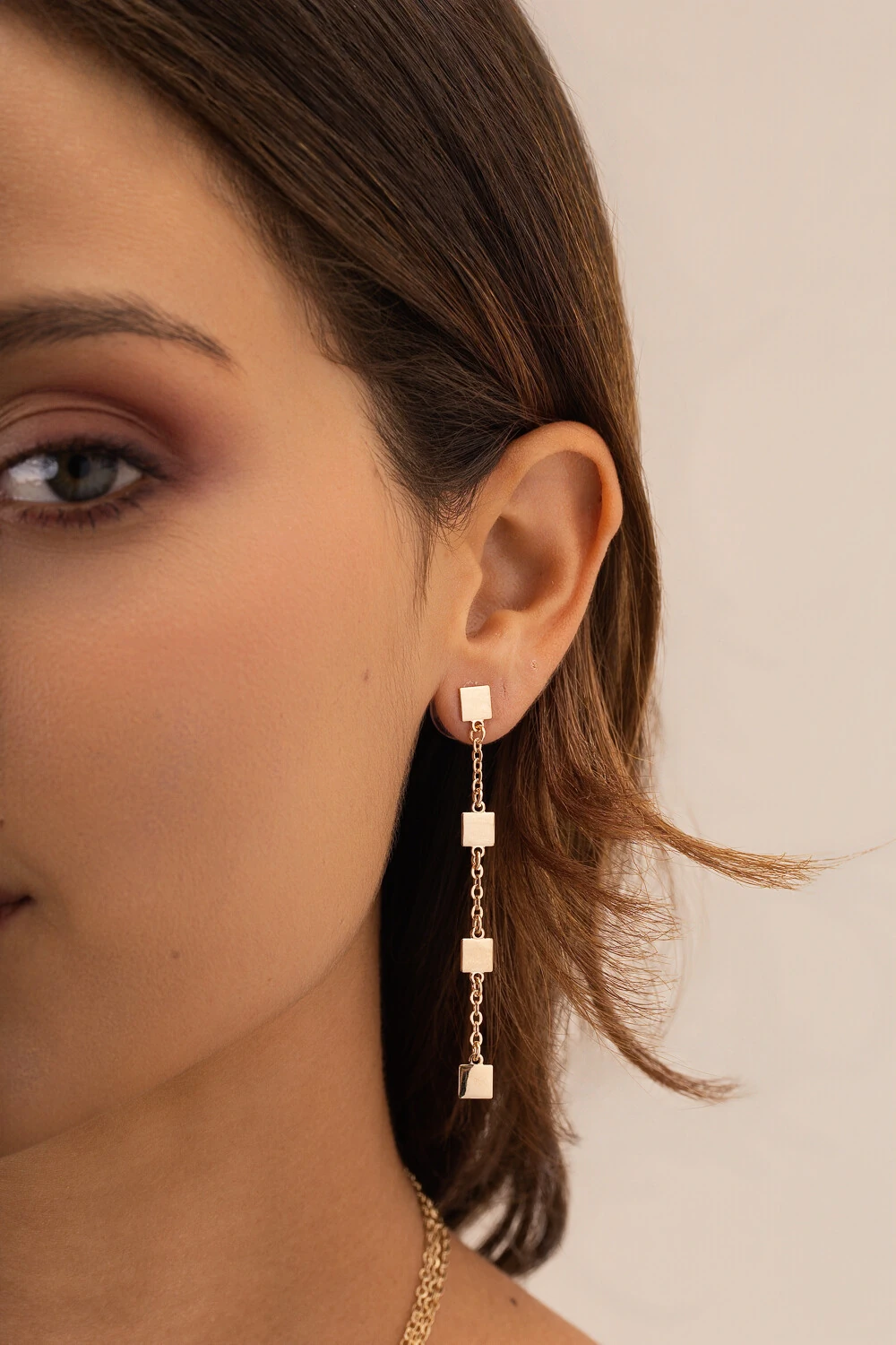 Delicado e moderno, o brinco dourado fio com cubos traz um design elegante e contemporâneo. Seu formato alongado com detalhes geométricos cria um efeito leve e sofisticado, valorizando o visual. É perfeito para usar no dia a dia ou em ocasiões especiais, adicionando charme e um toque moderno ao look.
