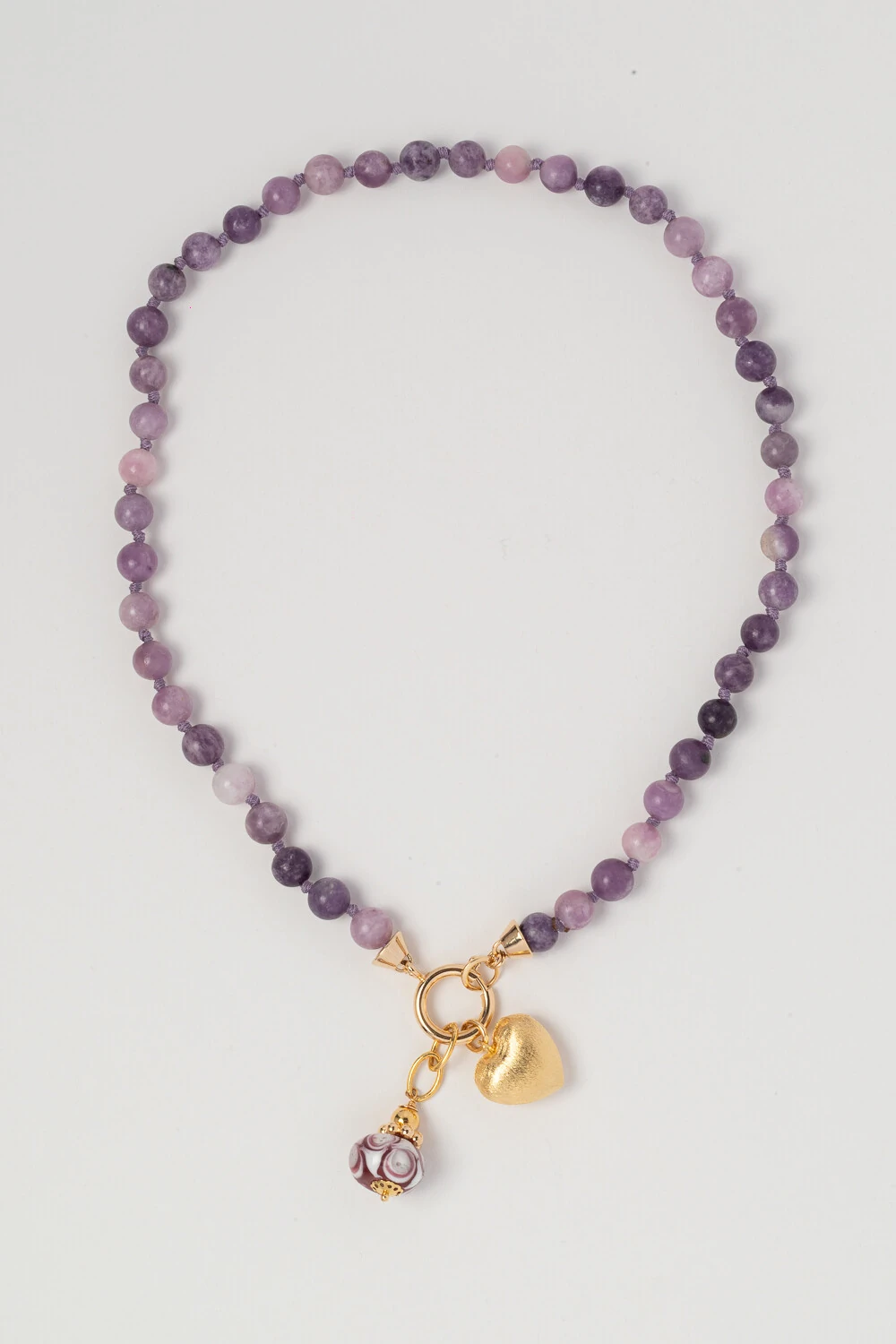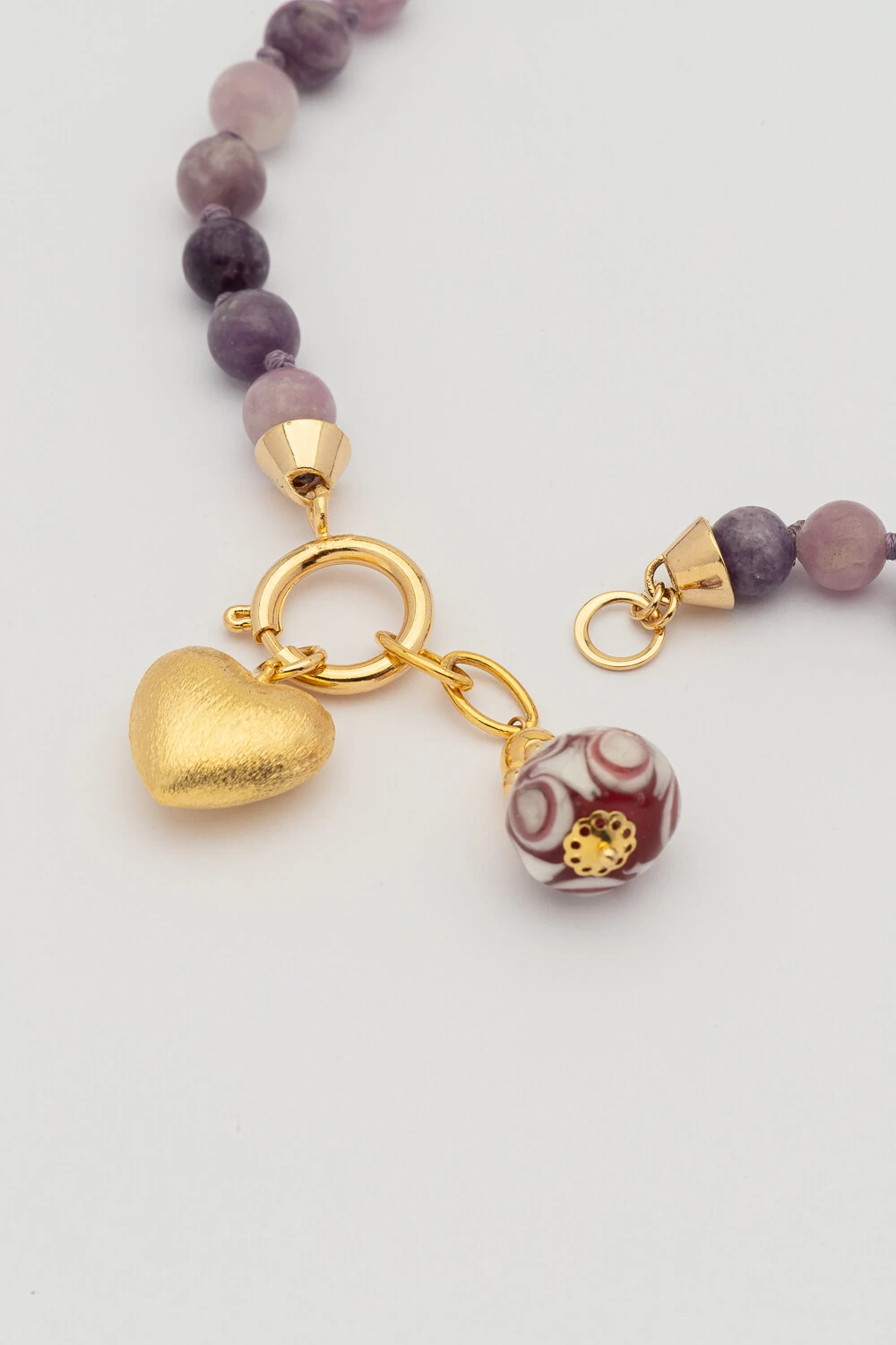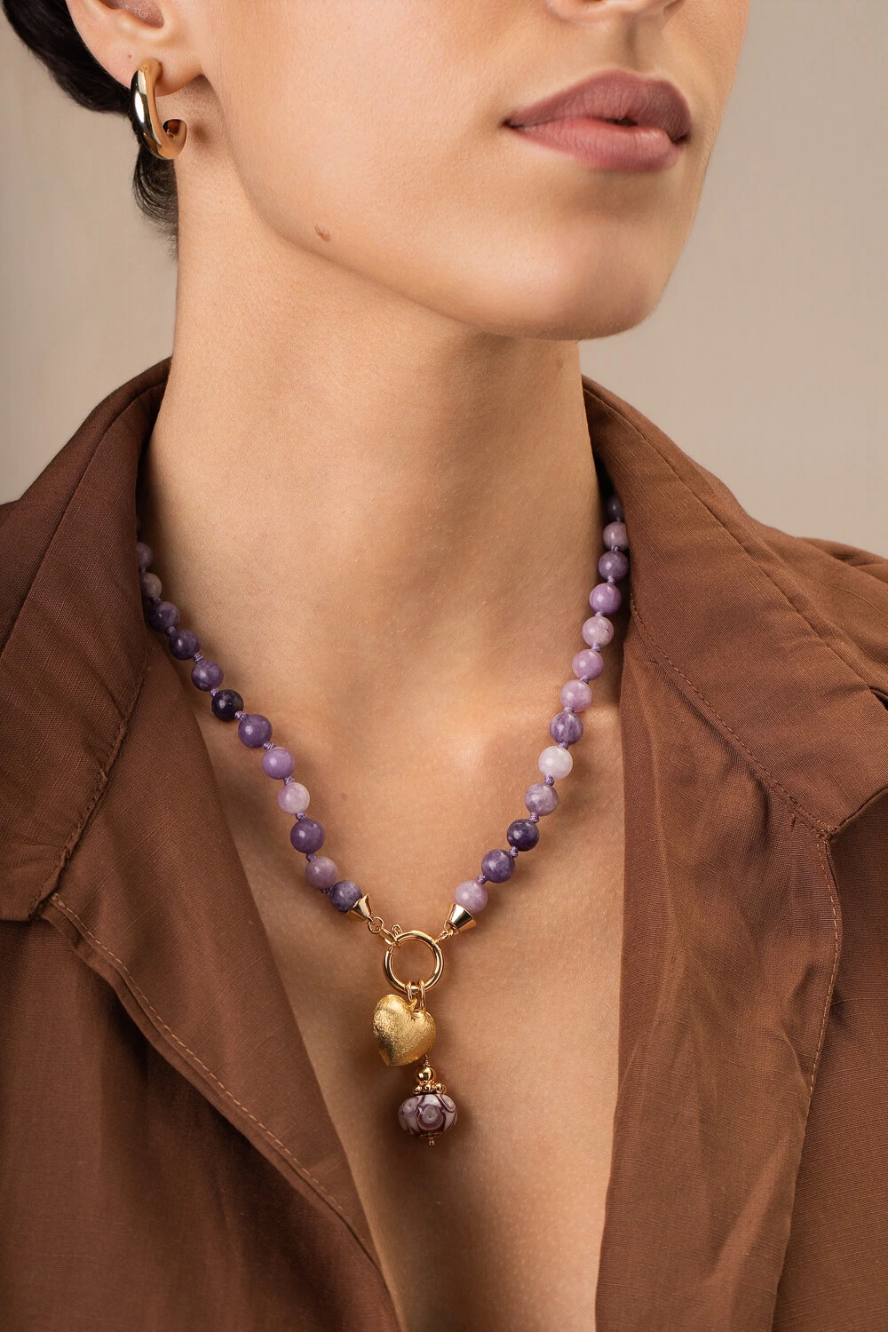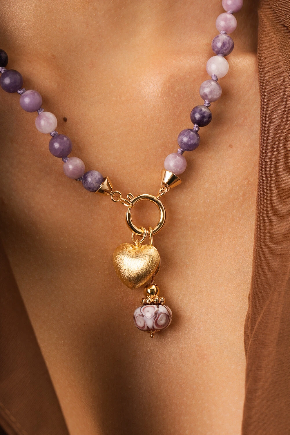 Autoral e cheio de significado, o colar com lepidolita na tonalidade lavanda traz um design encantador e sofisticado. Os pingentes de lanterna marroquina e coração adicionam um toque especial, unindo simbolismo, delicadeza e estilo.